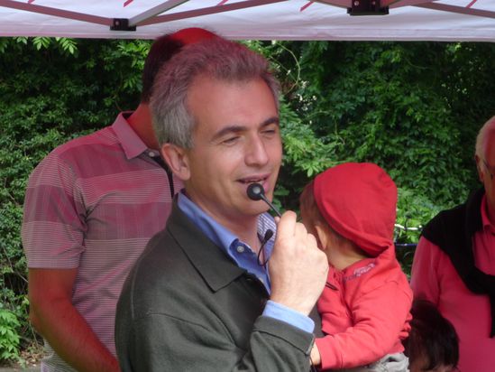 Peter Feldmann, stellvertretender Fraktionsvorsitzender der SPD im Römer, spricht, mit seiner Tochter auf dem Arm, zu den Gästen.